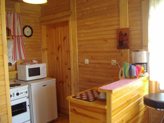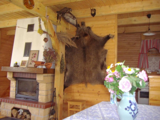 Domek wygodny, calkowicie wykonany z drewna.  Na parterze izba z kominkiem, aneksem kuchennym i lazienka. Na pietrze hall wypoczynkowy i 3 sypialnie, kazda z 2 miejscami do spania. Lacznie ok 100 mkw powierzchni. Na zewnatrz murowany grill, do dyspozycji gosci 2-osobowa lodka. Zezwolenia wedkarskie do kupienia na miejscu.